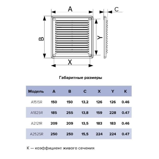 Предназначена для декоративного оформления выходов приточных или вытяжных вентиляционных систем. Вентиляционная решетка состоит из двух частей: рамки и решетки с жалюзи. Для чистки достаточно отделить решетку от рамки, которая крепится к стене. Изготавливается из полистирола, который меняет цвет под воздействием ультрафиолета. Поэтому рекомендуется использовать AR в местах, куда не попадают прямые солнечные лучи. Решетка оснащена наклонными жалюзи, которые помогают скрыть вентиляционный выход, а также антимоскитной сеткой для защиты от насекомых. Монтируется с помощью клея или саморезов.