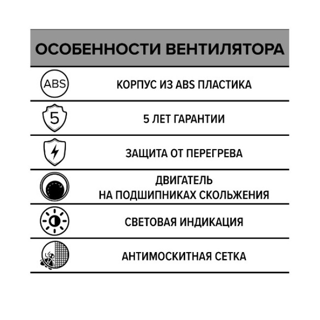Корпус и крыльчатка выполнены из высококачественного и прочного ABS-пластика, который надежно прослужит весь срок использования и не пожелтеет.