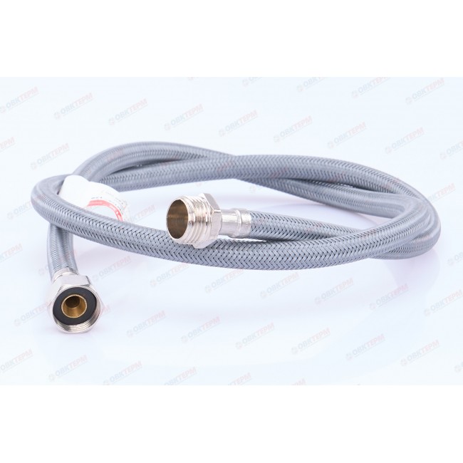 Концы шлангов снабжены соединительными фитингами с различными размерами штуцеров и накидных гаек. Надежность шланга и подводки обеспечивается еще и тем, что все соединительные детали выполнены из нержавеющей стали, а латунные гайки имеют достаточную высоту и толщину стенок.