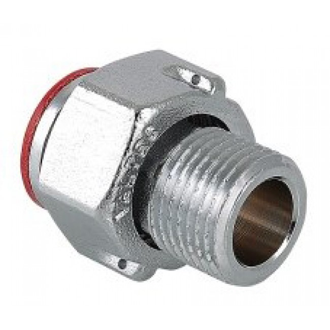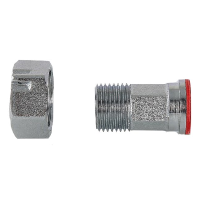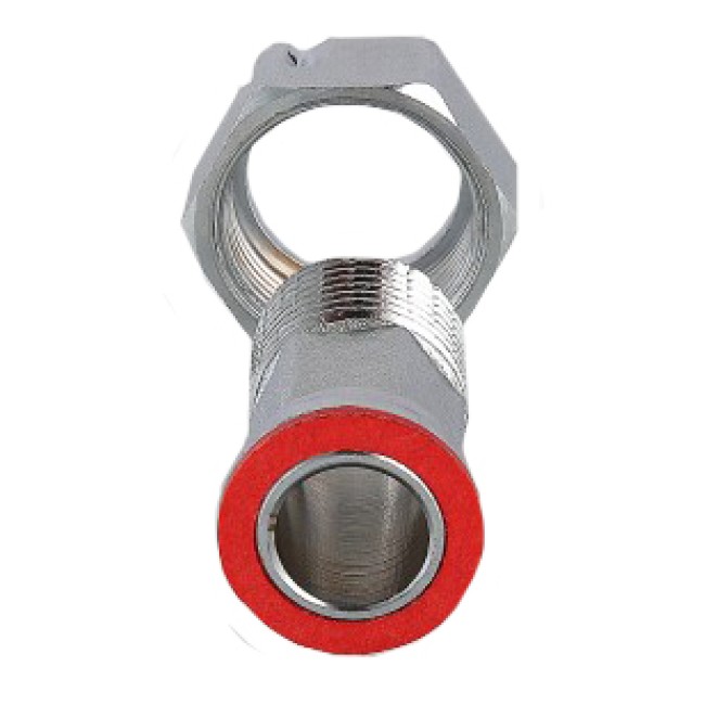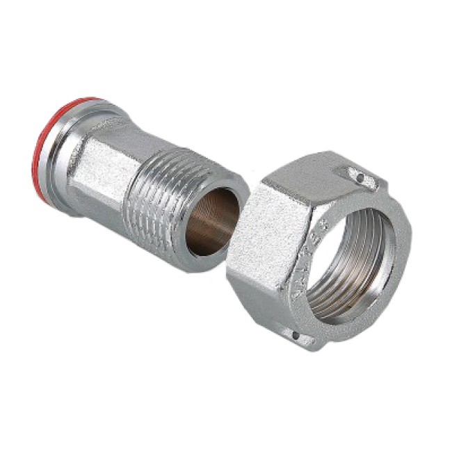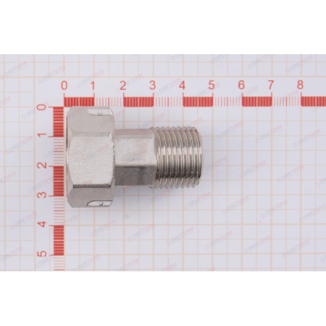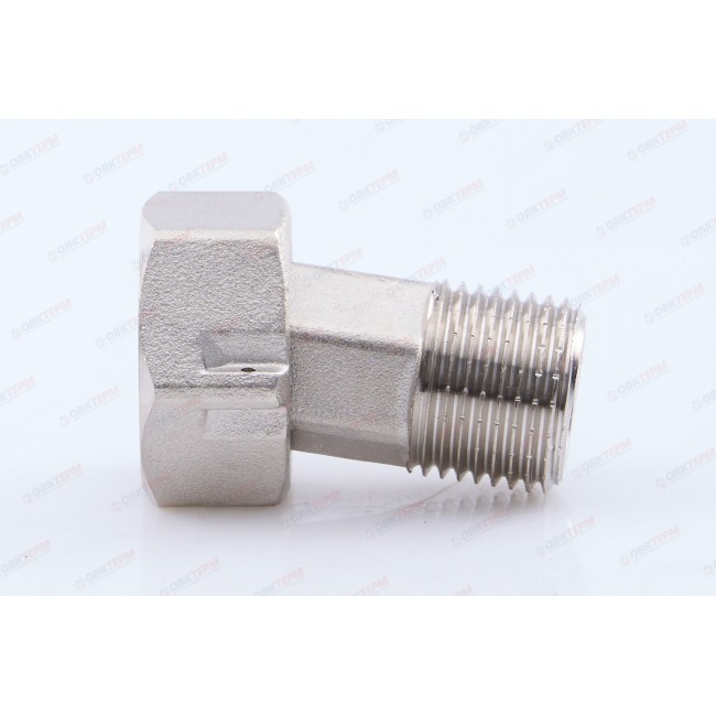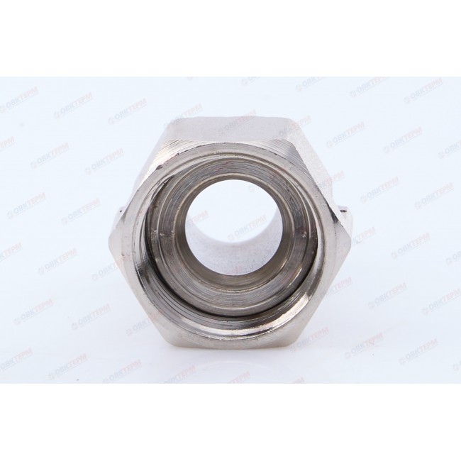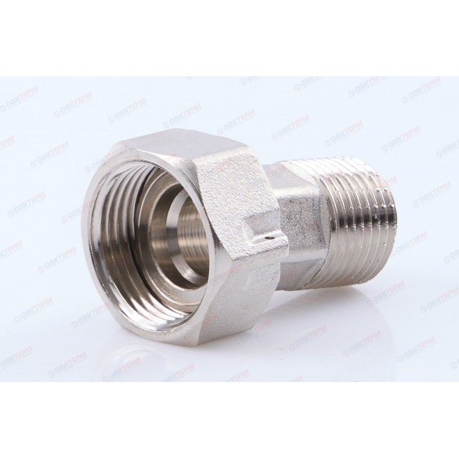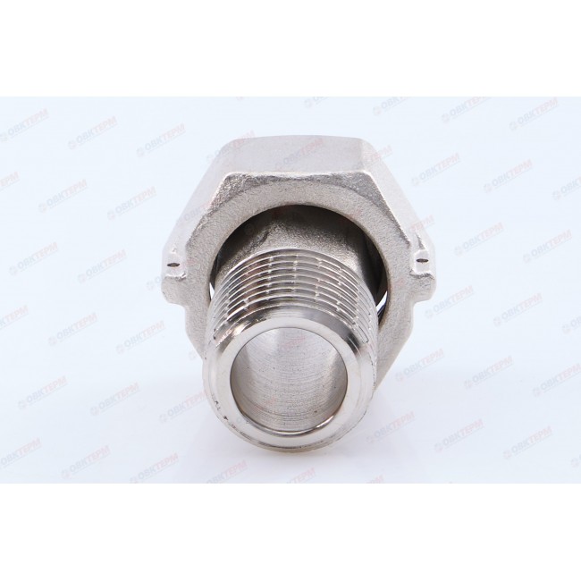 Латунный никелированный фитинг. Основное назначение – подключение водосчетчиков. Обеспечивает наличие прямых участков длиной в три условных диаметра до и после расходомера, необходимых для его точной работы. Накидная гайка имеет отверстие для пломбировки. Резьба со стороны без гайки: наружная, трубная цилиндрическая по ГОСТу 6357 (ISO 228, EN 10226).