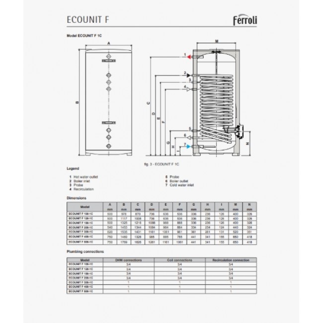 Бойлер косвенного нагрева Ecounit F 100-1C тэн 1.5кВт, c рецеркуляцией Ferroli