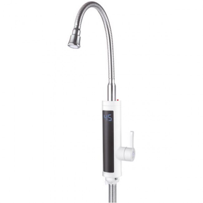 Электрический проточный водонагреватель, выполнен в виде смесителя. Предназначен для быстрого нагрева проточной холодной воды для бытовых целей, в помещениях где нет возможности провести горячую воду или поставить накопительный водонагреватель. Водонагреватель не предназначен для работы в неотапливаемых помещениях. Подключаемое рабочее давление варьируется от 0,04 до 0,5 МПа.В зависимости от модели крана, имеется либо цифровой дисплей отображающий температуру воды, либо световой индикатор режима нагрева,либо устройство защитного отключения (УЗО) Пропускная способность потока горячей воды от 2 до 2,5 литров в минуту.