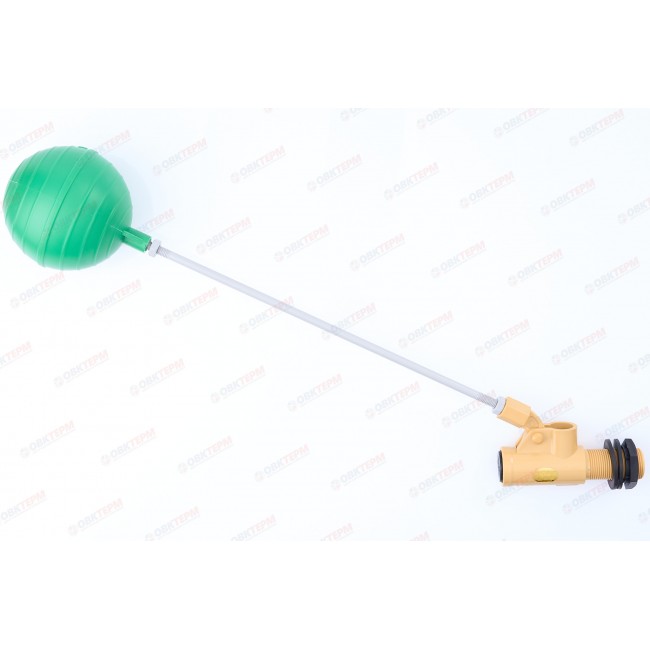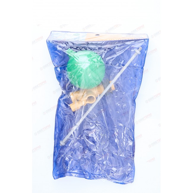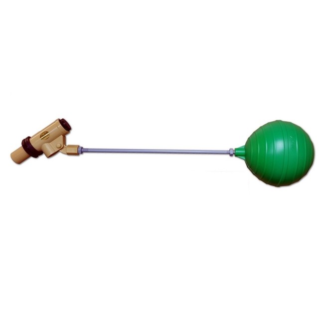 Поплавковый клапан Ду 15 мм (1/2``, пол дюйма) для наполнения бака с регулируемым пластиковым поплавком представляет собой недорогой вариант устройства для контроля уровня воды в емкости при поступлении воды из магистрали. Для установки поплавкового клапана вверху вертикальной стенки ёмкости сверлят отверстие диаметром равным внешнему диаметру запорного клапана, в которое изнутри вставляется корпус клапана. С обеих сторон корпуса бака устанавливаются резиновые прокладки, которые уплотняются при затягивании гайки снаружи бака. Для присоединения подводящего трубопровода клапан имеет наружную резьбу 1/2 дюйма. После открытия подачи воды в бак, по мере его заполнения, поплавок поднимется верхнюю отрегулированную точку уровня и через рычаг закроет запорный узел клапана и собственно подачу воды в ёмкость. По мере расходования воды поплавок под собственным весом через рычаг открывает запорный узел клапана – таким образом происходит повторное наполнение ёмкости до отрегулированного уровня.
