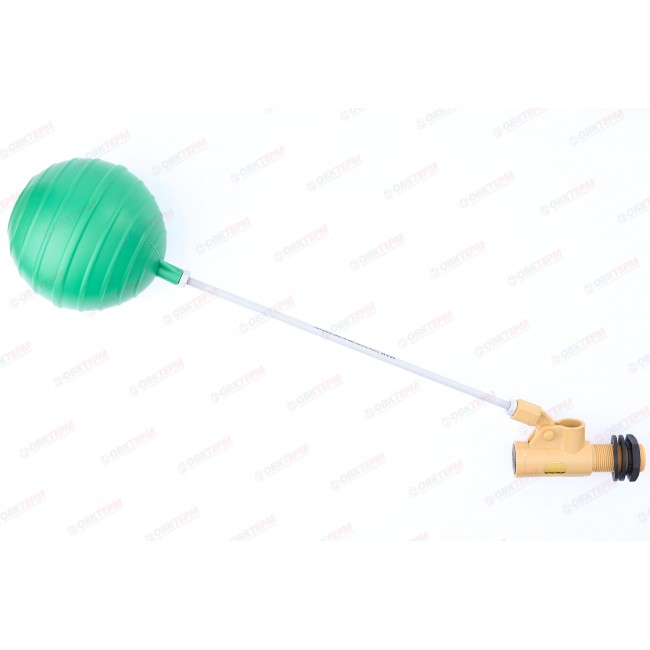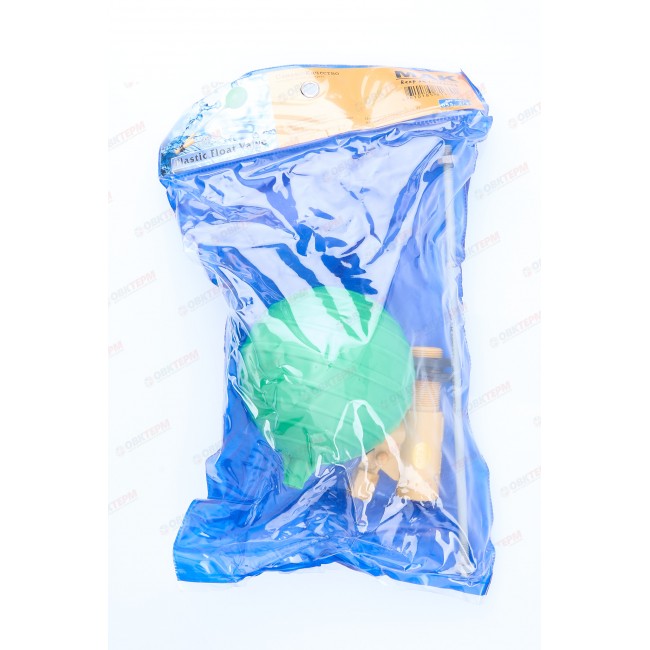 Поплавковый клапан ("3/4", пол дюйма) для наполнения бака с регулируемым пластиковым поплавком представляет собой недорогой вариант устройства для контроля уровня воды в емкости при поступлении воды из магистрали. Для установки поплавкового клапана вверху вертикальной стенки ёмкости сверлят отверстие диаметром равным внешнему диаметру запорного клапана, в которое изнутри вставляется корпус клапана. С обеих сторон корпуса бака устанавливаются резиновые прокладки, которые уплотняются при затягивании гайки снаружи бака. Для присоединения подводящего трубопровода клапан имеет наружную резьбу 3/4 дюйма. После открытия подачи воды в бак, по мере его заполнения, поплавок поднимется верхнюю отрегулированную точку уровня и через рычаг закроет запорный узел клапана и собственно подачу воды в ёмкость. По мере расходования воды поплавок под собственным весом через рычаг открывает запорный узел клапана – таким образом происходит повторное наполнение ёмкости до отрегулированного уровня.